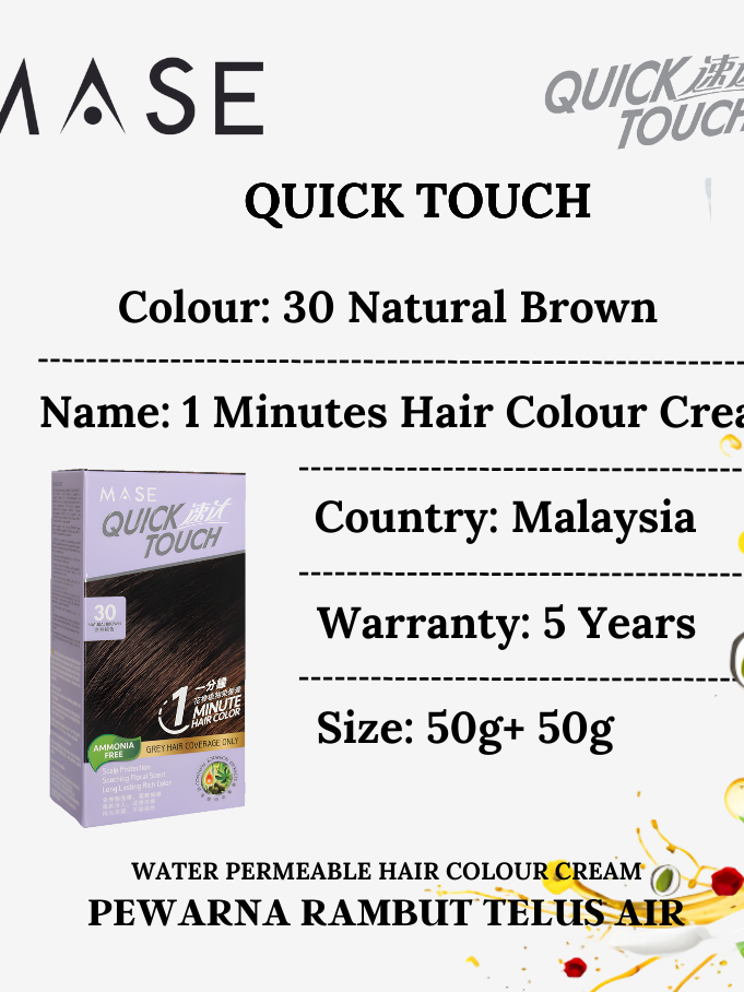 Specifications of QUICK TOUCH 1 MINUTE HAIR COLOR-30 Natural Brown for permanent hair dye color 2020